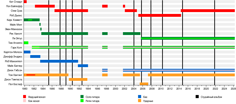 - Стив Суза — ведущий вокал (1986—1993, 2002—2004, 2014—наши дни)
